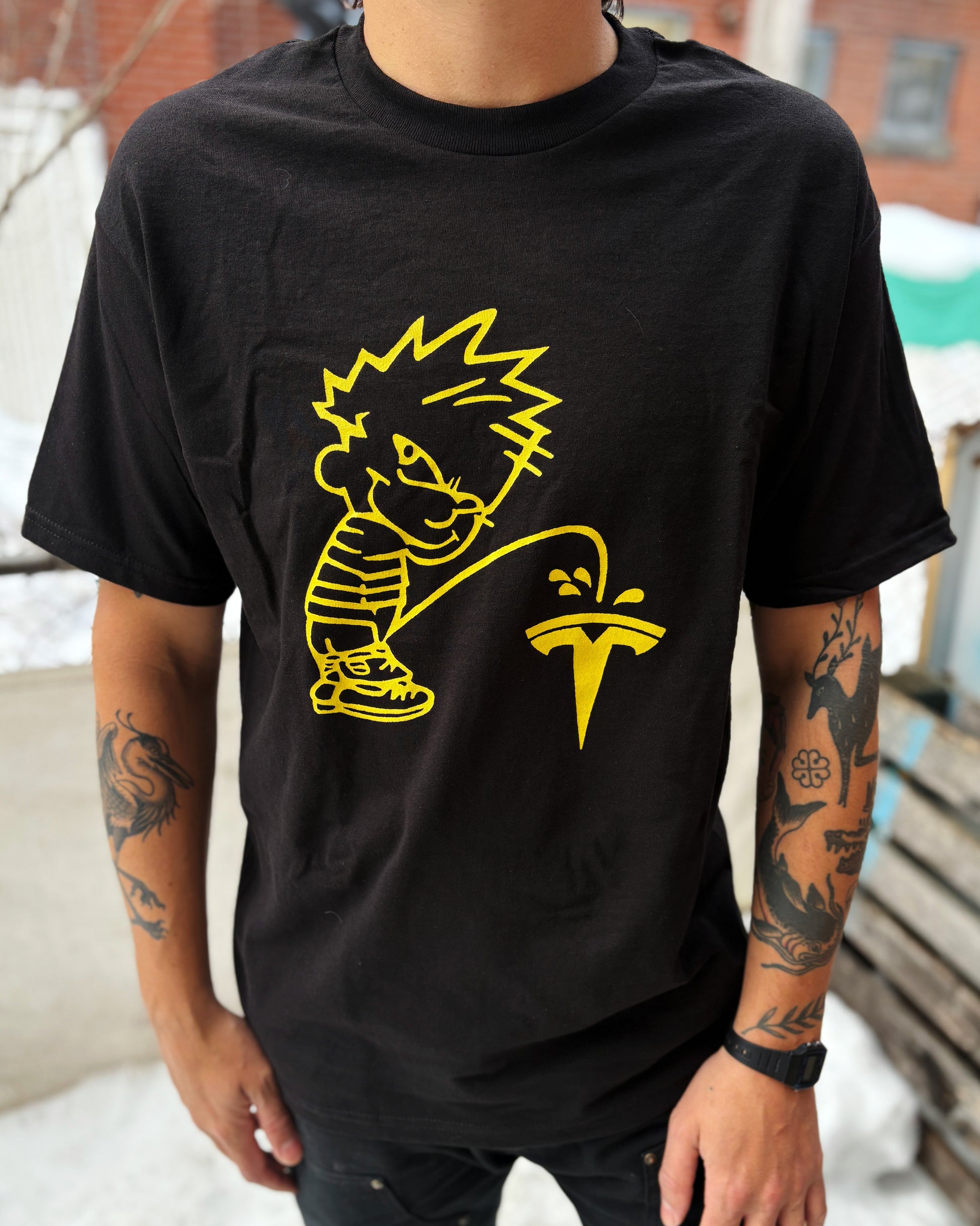 "eightyaday yellow" screenprint on a black american apparel shirt printed in Montreal.