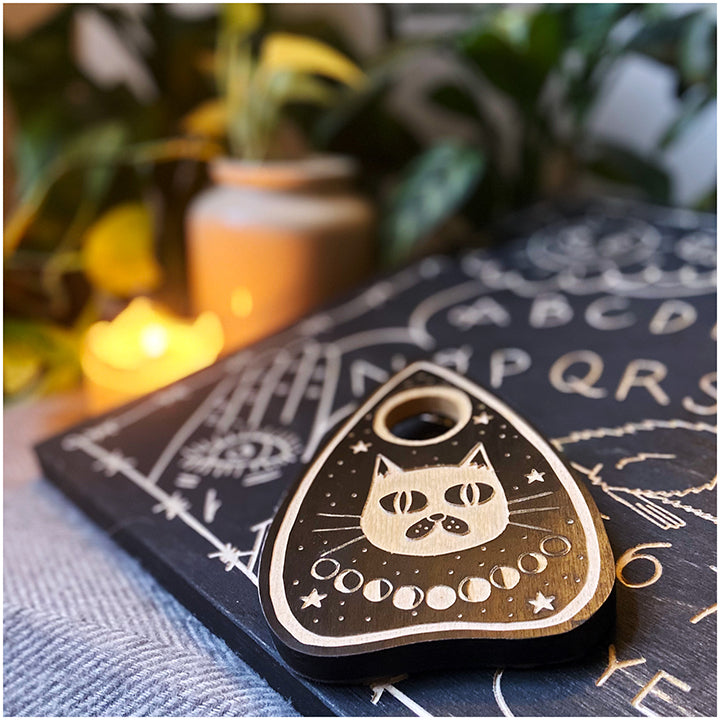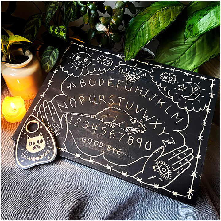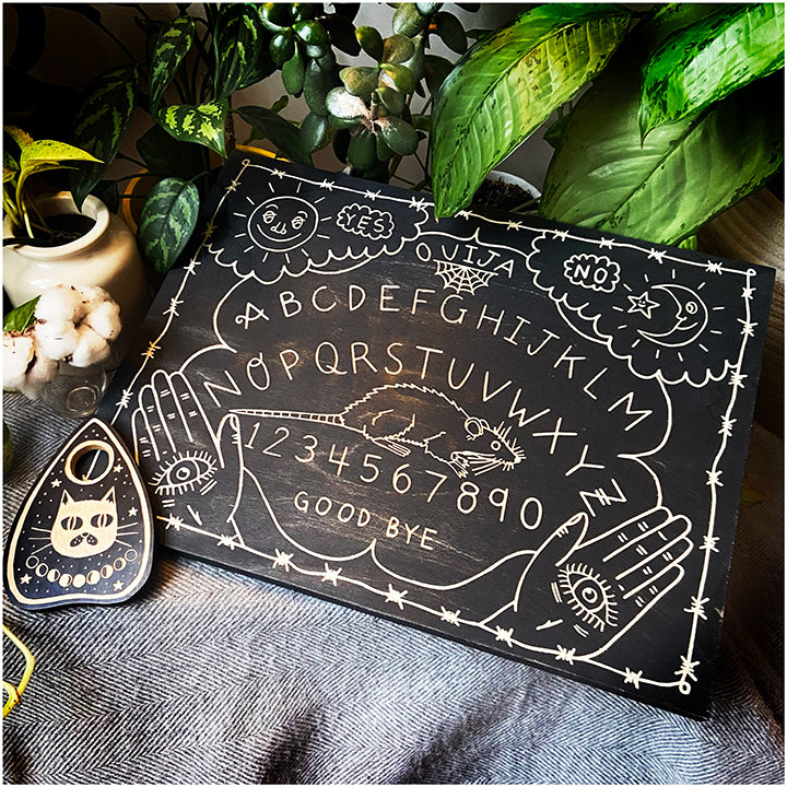 Created during the lock-down of the pandemic, the ouija boards were designed by me and then brought to fruition with a TON of help from my friend Fred Bouin at his wood shop.